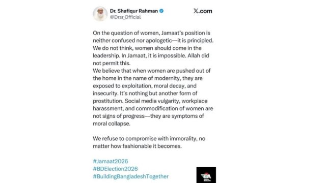 শনিবার (৩১ জানুয়ারি) বিকেলে ডা. শফিকুর রহমানের এক্স অ্যাকাউন্টে দেওয়া একটি পোস্টে নারীদের অবমাননাকর বক্তব্য রয়েছে বলে অভিযোগ ওঠে। পোস্টটিতে বলা হয়, আধুনিকতার নামে নারীদের ঘরের বাইরে নিয়ে যাওয়ার ফলে তারা শোষণ ও নিরাপত্তাহীনতার শিকার হয়, যা পতিতাবৃত্তির সঙ্গে তুলনা করা হয়েছে।